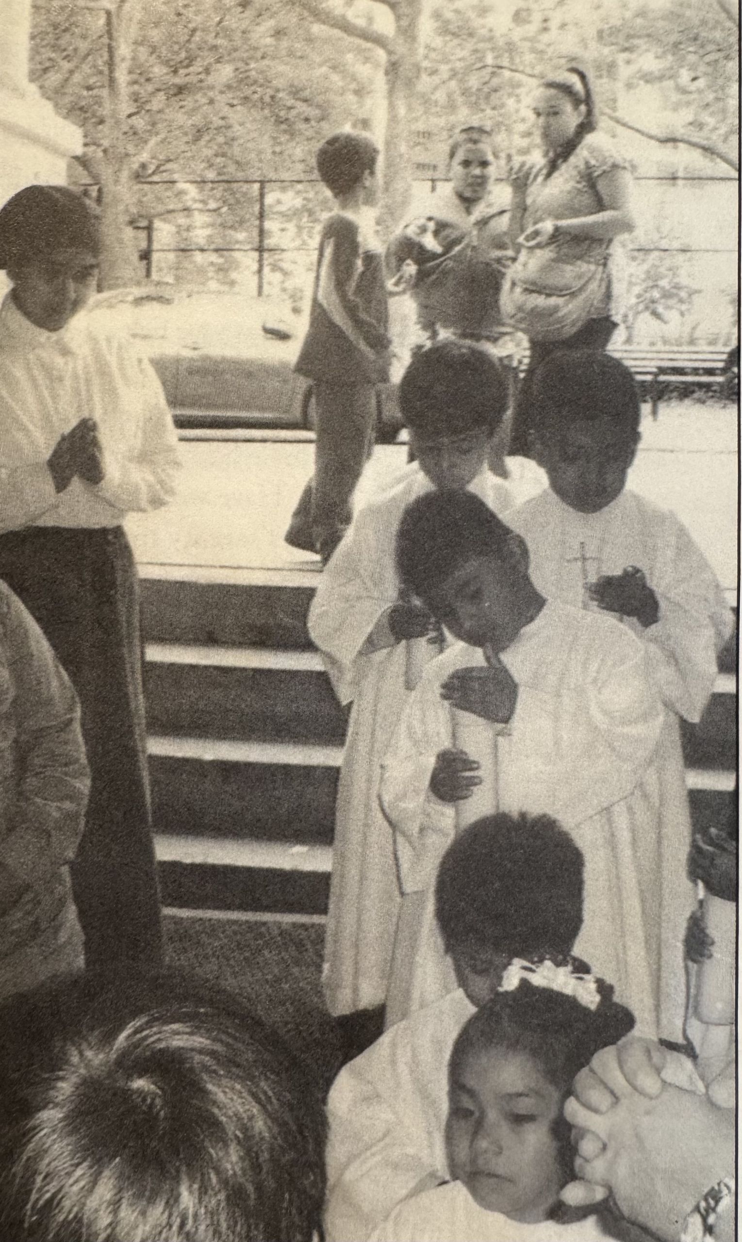 Le dimanche, après la cérémonie de la Lumière de la veille, les enfants arrivent à l’horaire habituel à 9h30. La messe est à 11h30 . Nous faisons une petite répétition et les enfants remettent leur vêtement blanc. Ils sont attentifs pendant la messe et reçoivent l’Eucharistie avec révérence. Alors qu’ils reviennent à leur place pour s’agenouiller et prier, certains semblent extatiques, les yeux fermés, dans une grande intimité avec Jésus. Ceux qui les voient ont du mal à retenir leurs larmes.